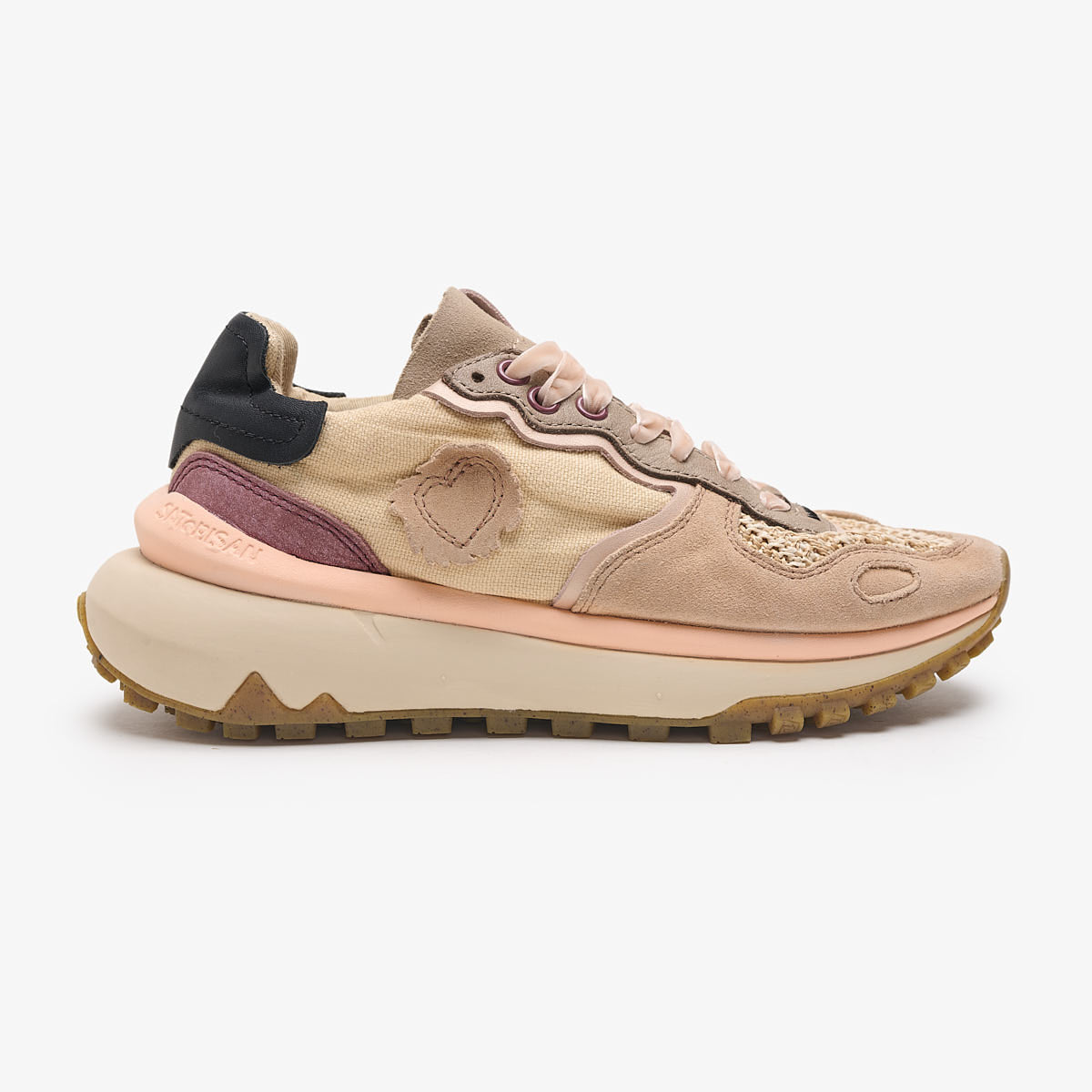 Cordones extra con acabado aterciopelado y ojales a color en contraste con la piel.Nuestra suela Metta Love, voluminosa a la vez que ligera.