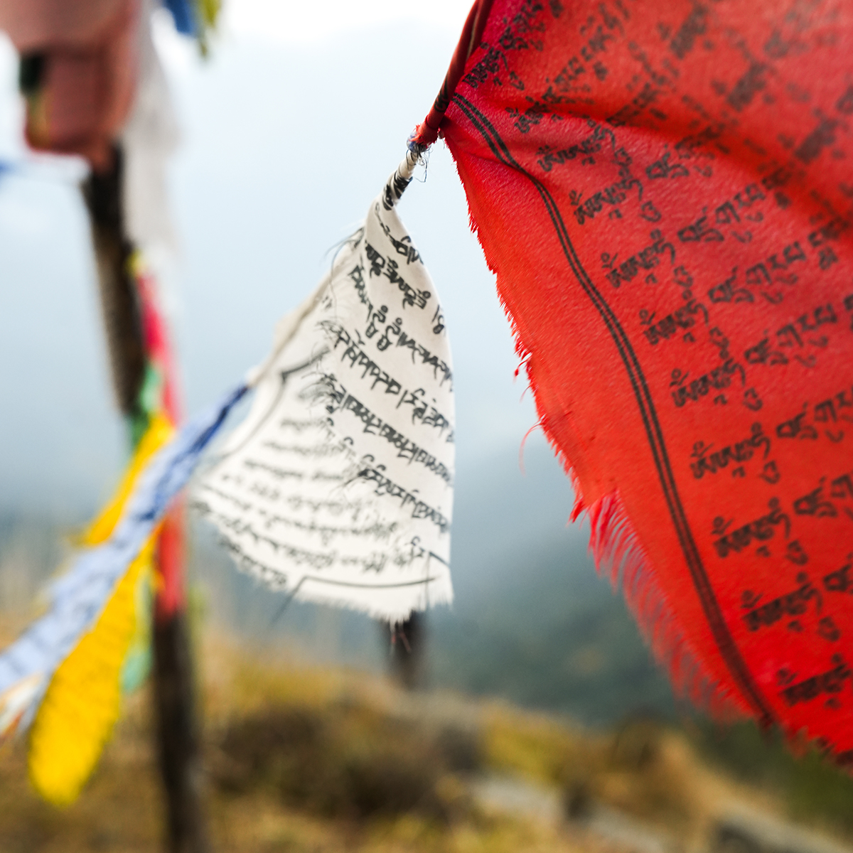 Inspirada en las banderas de oración tibetanas, cada color representa un elemento y una energía: El azul representa el cielo, el blanco el aire, el rojo el fuego, el verde el agua y el amarillo la tierra.