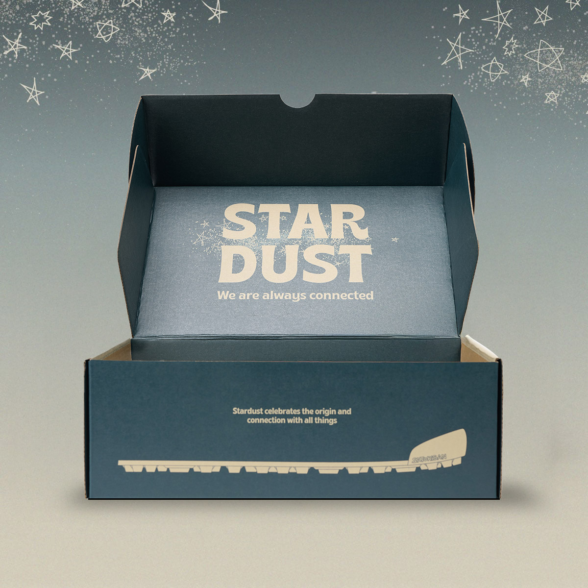 Cada detalle del packaging de Stardust rinde homenaje a nuestro origen cósmico. Tanto la caja como el papel que envuelve las zapas está completamente decorada con estrellas, nebulosas y patrones fractales. En la parte superior hemos grabado las suelas, como si pisaran polvo lunar. Un relieve que invita a tocarlo, convirtiendo el diseño en una experiencia visual y también sensorial. En su interior encontramos varios mensajes que nos invitan a recordar nuestro origen cósmico y la interconexión entre nosotros.