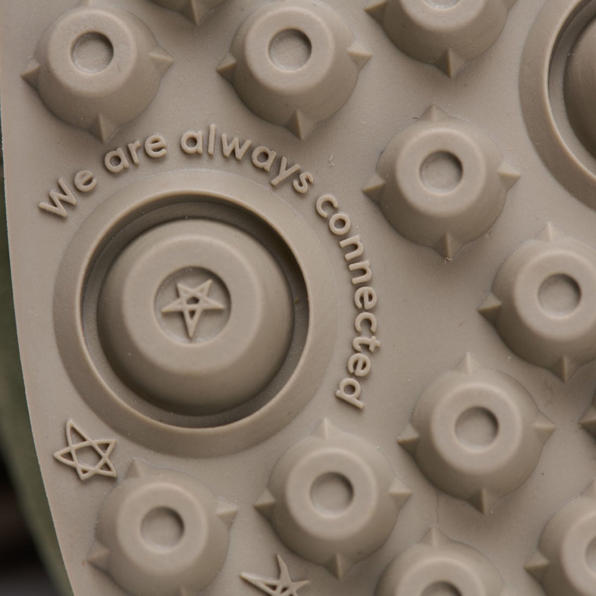 Cada detalle del packaging de Stardust rinde homenaje a nuestro origen cósmico. Tanto la caja como el papel que envuelve las zapas está completamente decorada con estrellas, nebulosas y patrones fractales. En la parte superior hemos grabado las suelas, como si pisaran polvo lunar. Un relieve que invita a tocarlo, convirtiendo el diseño en una experiencia visual y también sensorial. En su interior encontramos varios mensajes que nos invitan a recordar nuestro origen cósmico y la interconexión entre nosotros.