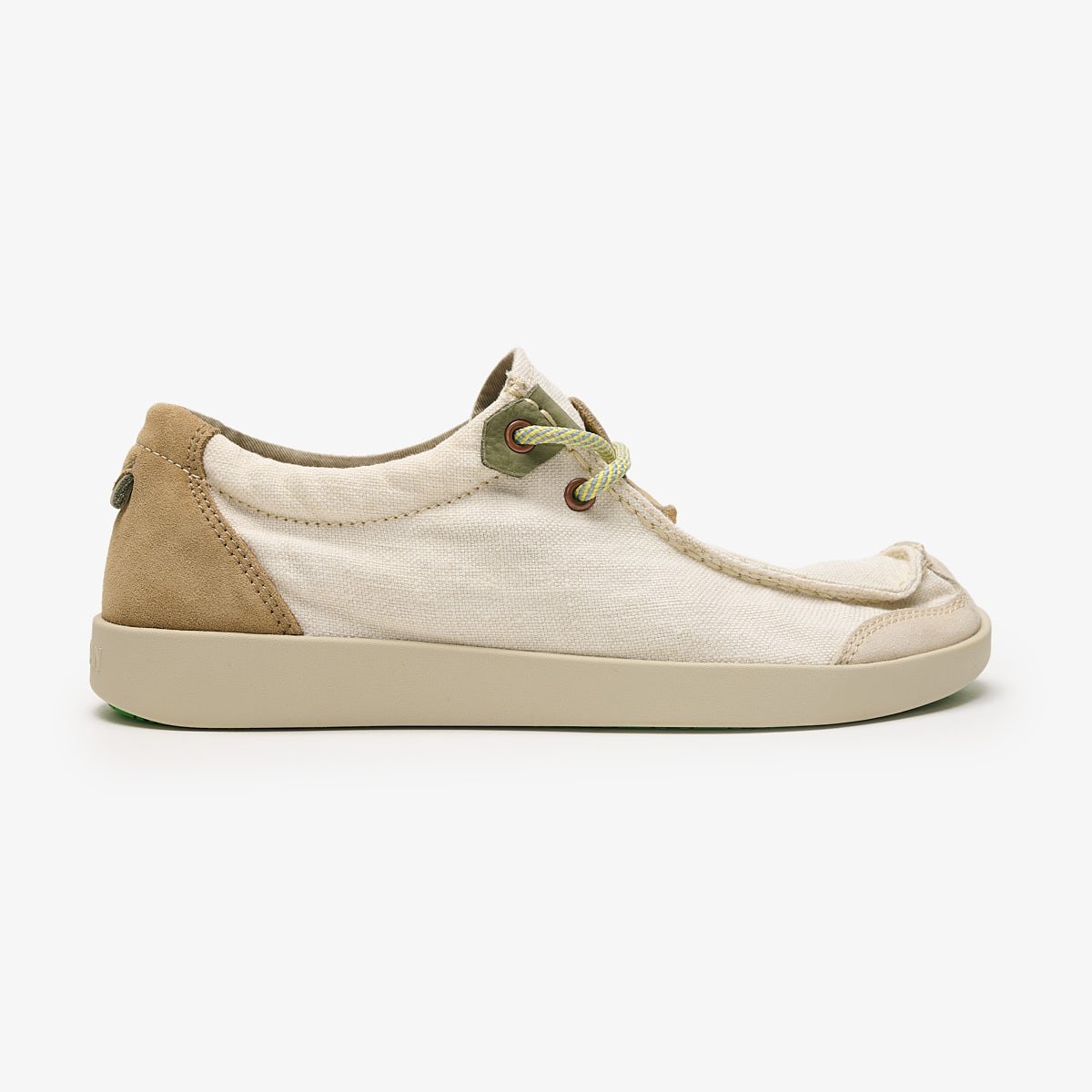 The lightest and most summery version of Kwahu, made of high quality linen. Inspired by the Hopi artisans' favourite Kachina, this model pays homage to wild nature and craftsmanship. This reinterpretation of the 1960s wallaby moccasins combines comfort, style and unique details, evoking the movements and majesty of the eagle with every step.